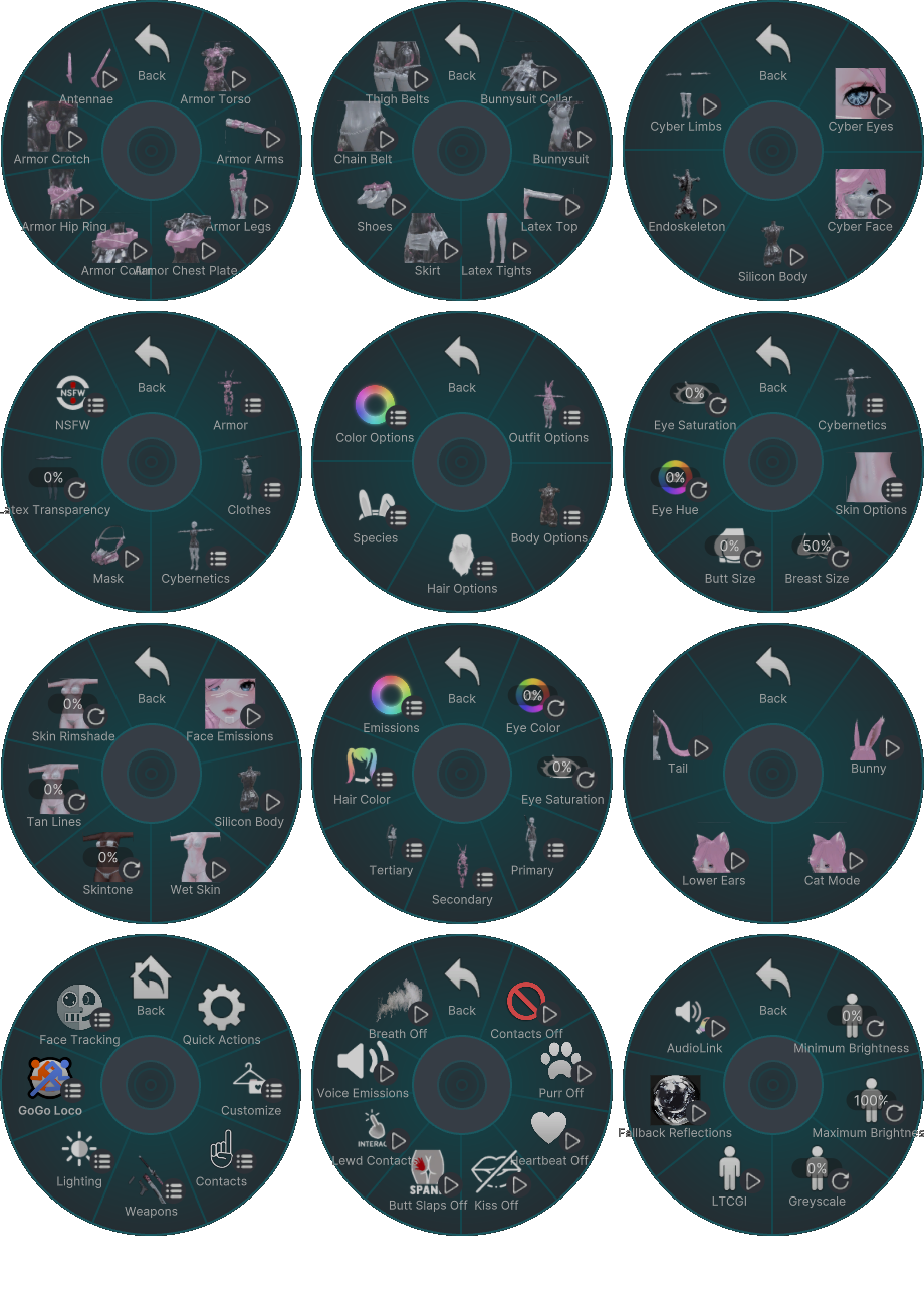 - Emissions with Audio link, voice activation, RGB mode, and full control with sliders for Hue, Saturation, Strength